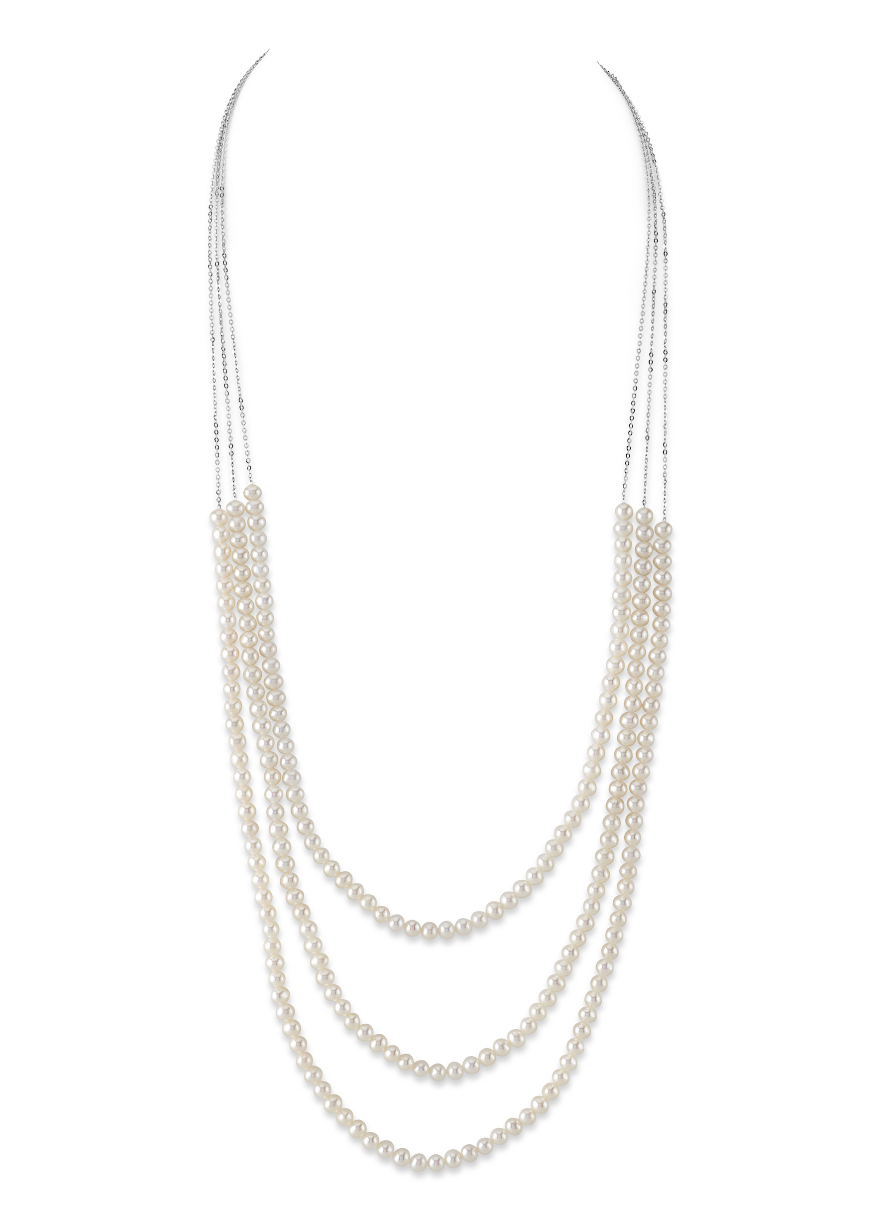 This stylish triple pearl necklace measures at 24" in length and features 4.0-4.5mm AAA quality Freshwater pearls hand picked for their incredible luster. This style is designed with 3 rows of 14K chain, which complement the white pearls to make this piece absolutely stunning. The necklace measures at matinee length of 24 inches and affixed with a spring clasp. This item comes packaged in a beautiful jewelry gift box, perfect for gifting.