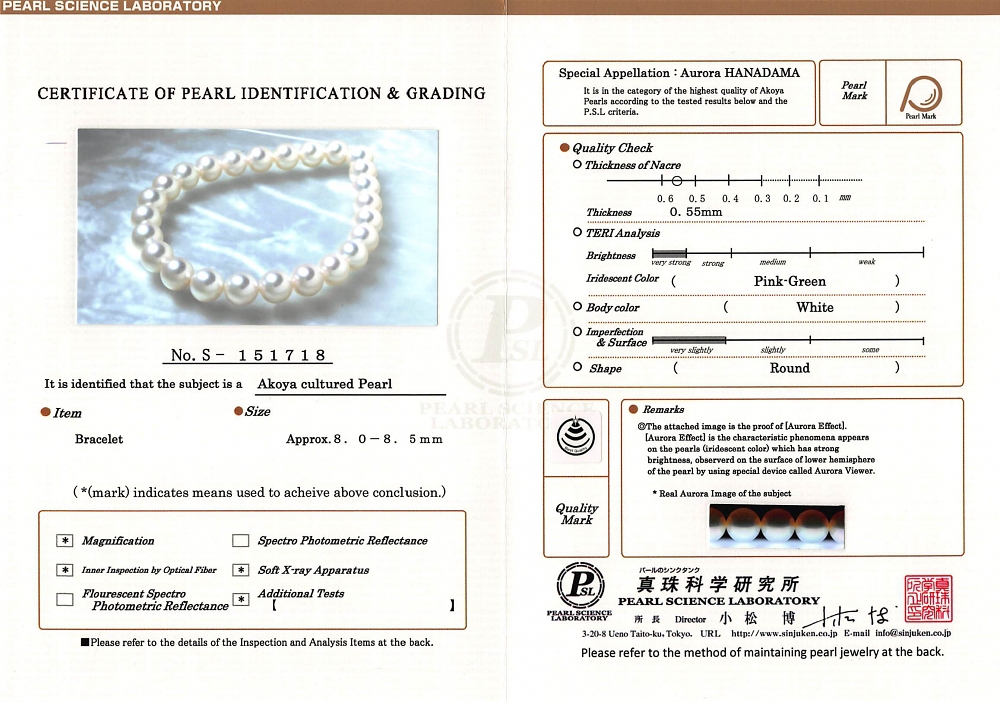 Hanadama, meaning 'Flower Pearl,' represents the highest quality available in Japanese Akoya Pearls, certified by the Japan Pearl Science Laboratory. Only approximately 2% of the annual Akoya cultured pearl harvest qualifies for the Hanadama Grade. This beautiful Akoya pearl bracelet ranges between 8.0-8.5mm in size and consists of all beautiful and extremely lustrous Hanadama pearls. All pearls in this bracelet are perfectly round and are strung with silk thread and double-knotted between each pearl. This bracelet comes standard with a beautiful 14K gold clasp, though premium clasps can be selected for an additional cost. Known as the 'icon' of cultured pearls, Akoya pearls have graced the necks, ears, fingers, and wrists of women for decades. The Pearl Source imports their Akoya pearls from the saltwaters of Japan, grown in the Pinctada fucata oyster. All of our Akoya pearl necklaces are made on site, and our extensive experience and careful attention to detail allows us to create truly beautiful Akoya pearl necklaces.
