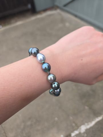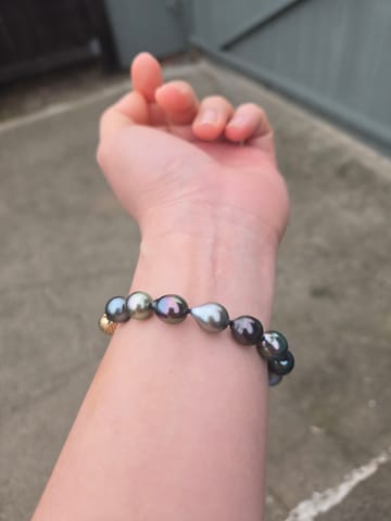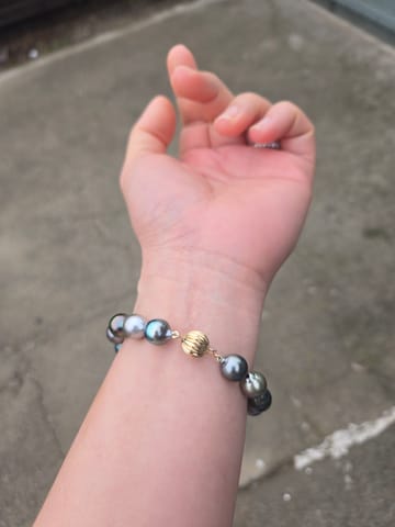 My bracelet is really beautiful. It doesn’t look exactly like the picture, but I like it even better! My pearls are not as round as they appear in the picture, but are unblemished and beautiful. They have excellent sheen and color. I took advantage of their on line texting feature (in real time), and was able to ask questions about this bracelet and another, about the pearls’ colors and shapes, before making my selection. Very helpful. Make sure when you measure for a bracelet to leave extra room because of the pearls. I usually wear a 7 but ordered a 7 1/2 and it fits just right. Could have even used another 1/4 inch for more drape. The clasp is a bit challenging for me, but should definitely be secure. Overall, I’m very pleased and wouldn’t hesitate to order from the Pearl Source again.