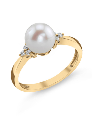 This beautiful pearl ring features a lustrous AAAA quality 7-8mm white Freshwater pearl, imported directly from the pearl farms of China. The pearl is mounted with dazzling SI clarity diamonds on a 14K gold band. This ring is available in a number of sizes for the perfect fit.