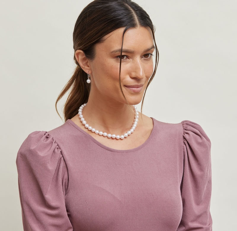 Model is wearing Elegance earrings with 9-10mm AAAA quality pearls