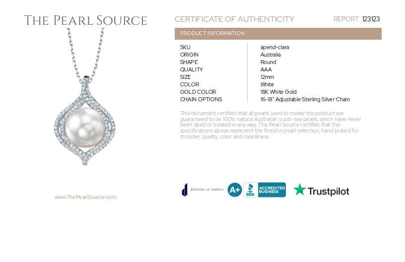 This 12mm White South Sea pearl pendant is made with a gorgeous AAA quality pearl with 'Very High' luster (please see our pearl grading section for more information). All White South Sea pearls are imported directly from the shores of the Australia, where only the highest quality pearls are produced and harvested. This pearl pendant is comprised of approximately .49 carats of SI-quality diamonds and is made of 3.79 grams of the highest quality 18K gold. If you want to complete your pearl jewelry set, make sure you take a look at the earrings and ring featured at the bottom of the page. All of our pearl pendants are made on site, and our experienced staff of GIA certified specialists pay careful attention to all details in order to create a truly beautiful pearl pendant. The pearl pendant comes in a beautiful jewelry gift box. Please view the options below to customize your pearl pendant.