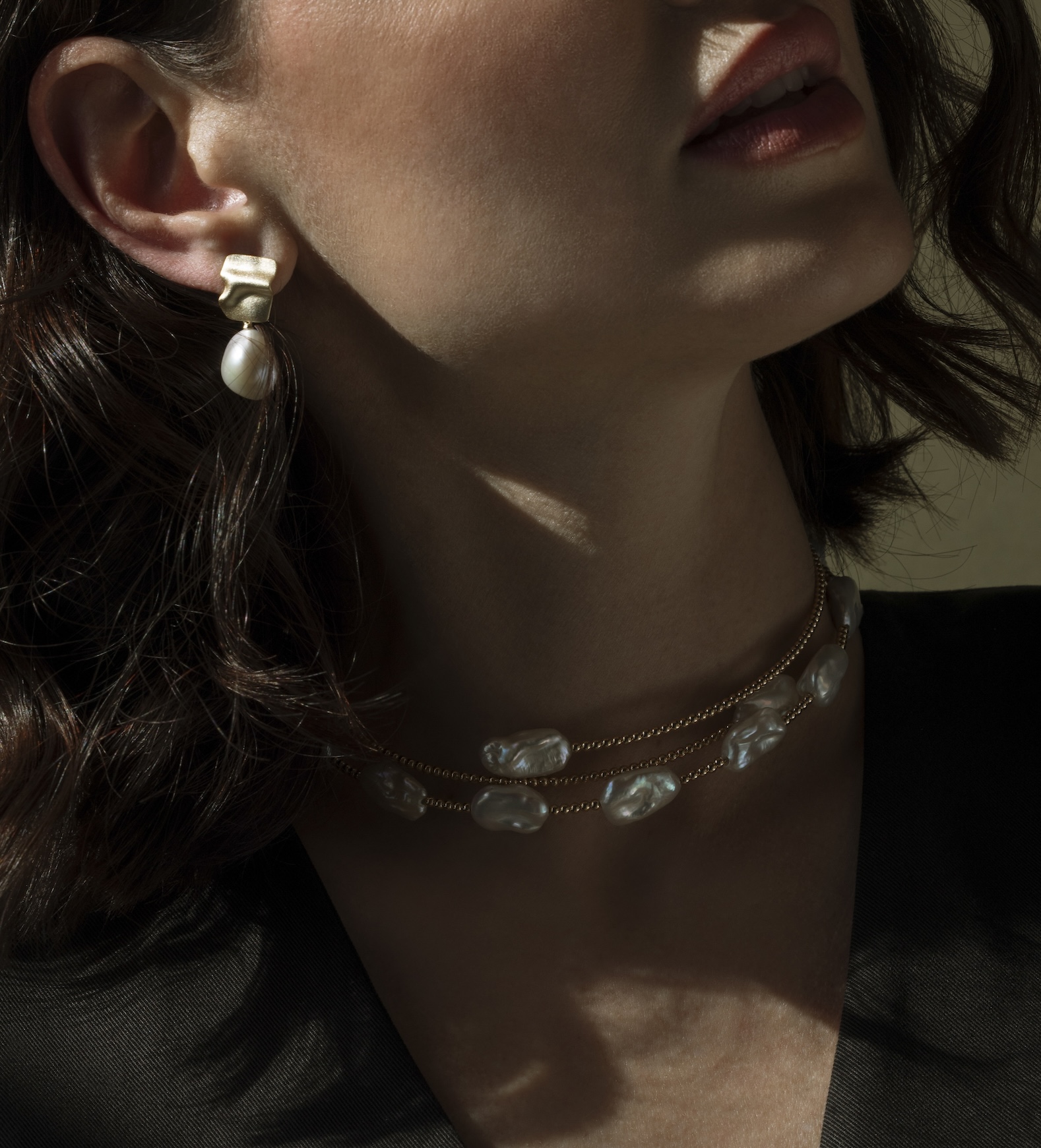 14K Gold White Baroque Freshwater Pearl Beaded Bangle Mira Necklace